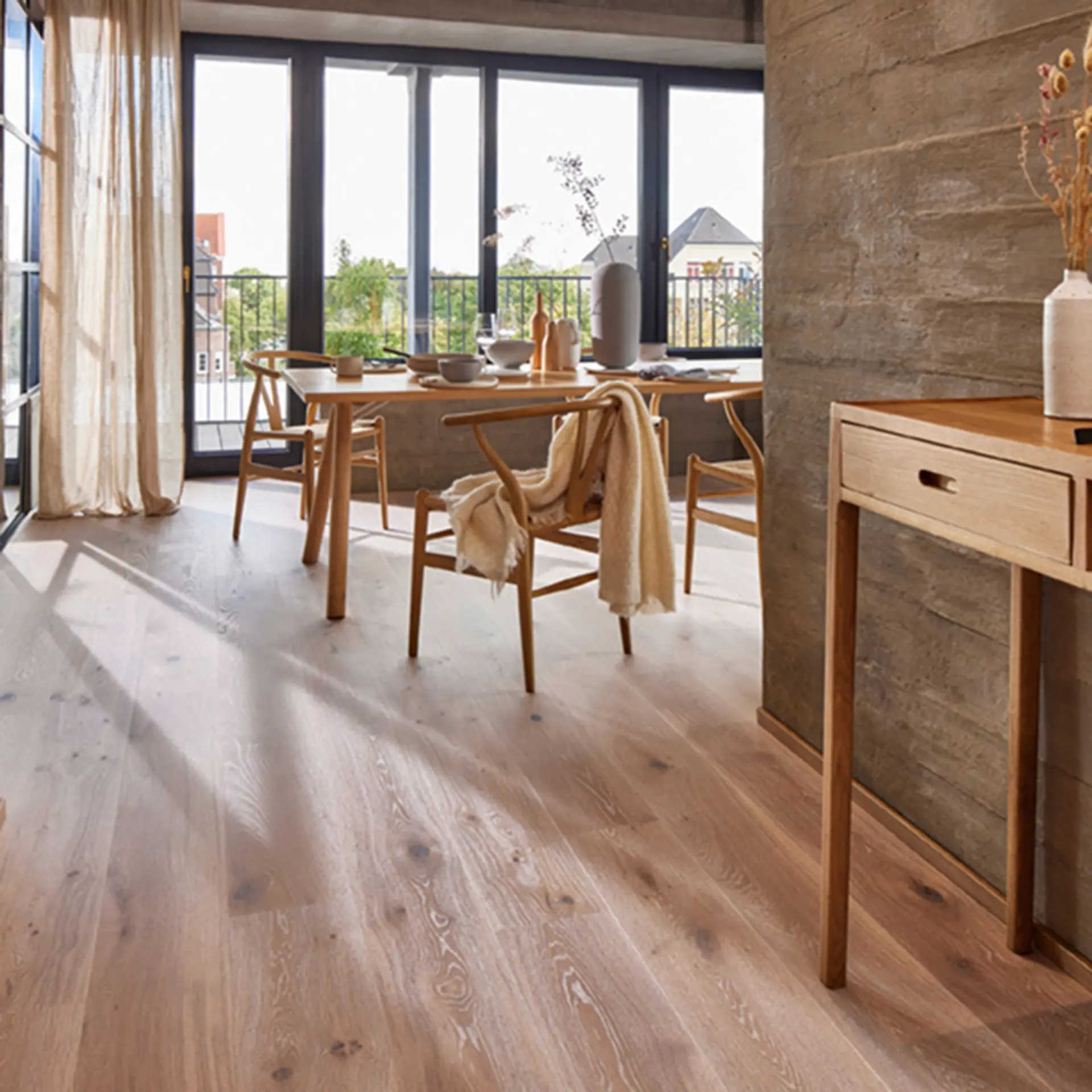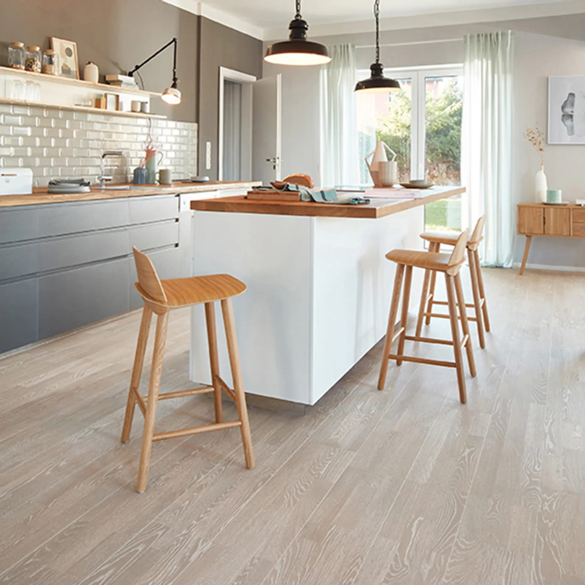 De lyse gulvene passer godt til stilen som er typisk for moderne, nordisk interiør. De gir en illusjon av at rommet er større. Du kan gjerne bruke møbler i mørkt tre i rom med lyse gulv.