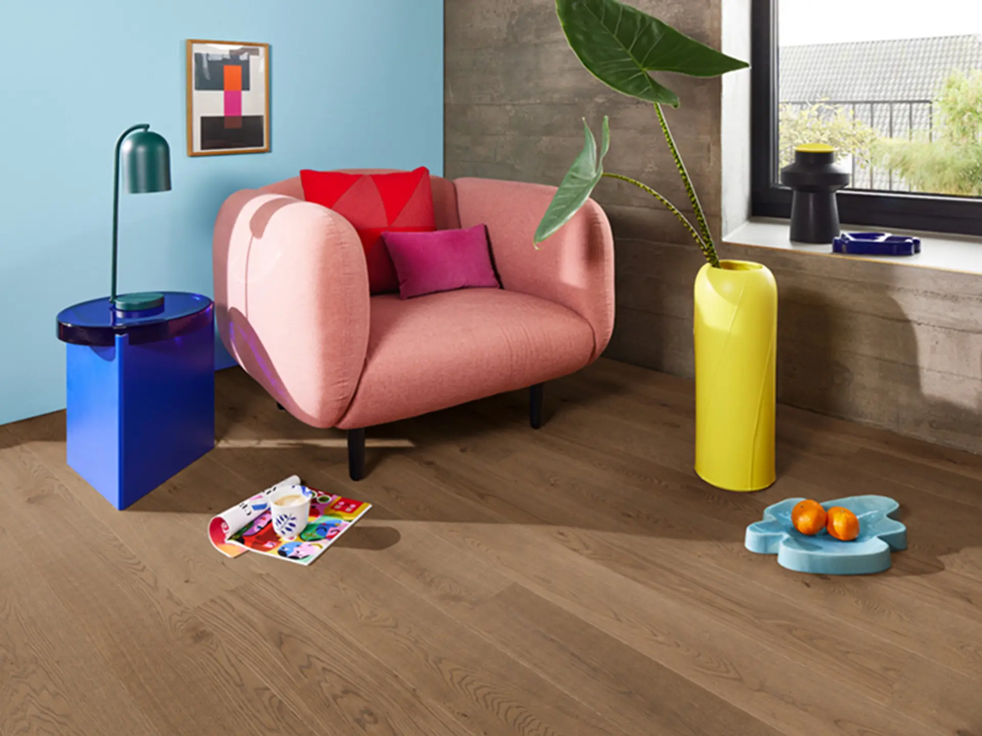 Bilde: Morsomt og hyggelig med farger på både gulv og vegger. Dette er Eik Medium Grey fra Boen. (Foto: Boen)