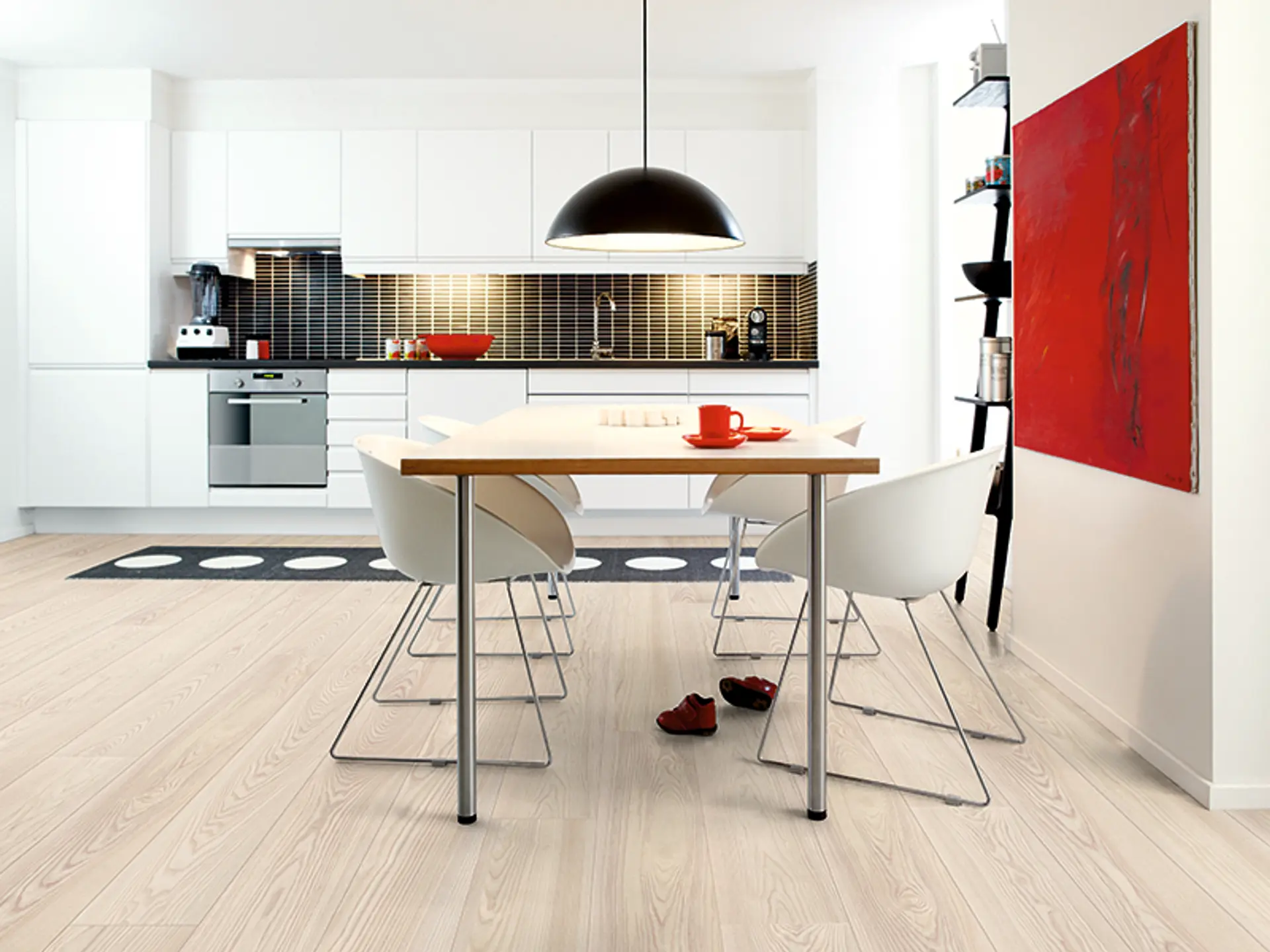 Bilde: Dette kjøkkenet blir både lyst og lekent med lyse gulv og vegger. Et blankt lerret for fargene i kunst på veggene. (Foto: Boen)