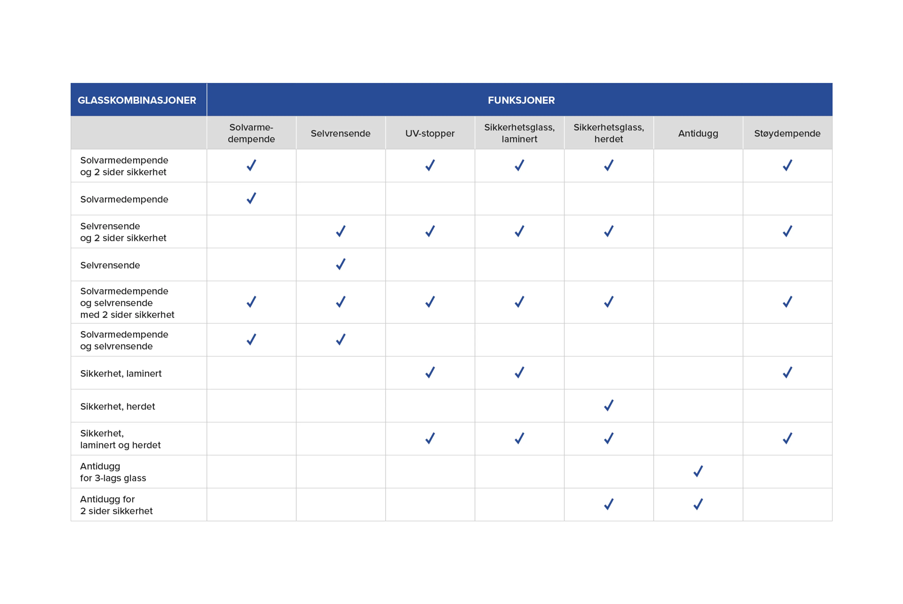 Dessverre kan ikke alle funksjonsglassene kombineres, men her ser du hvilke du kan ha i samme vindu eller balkongdør: