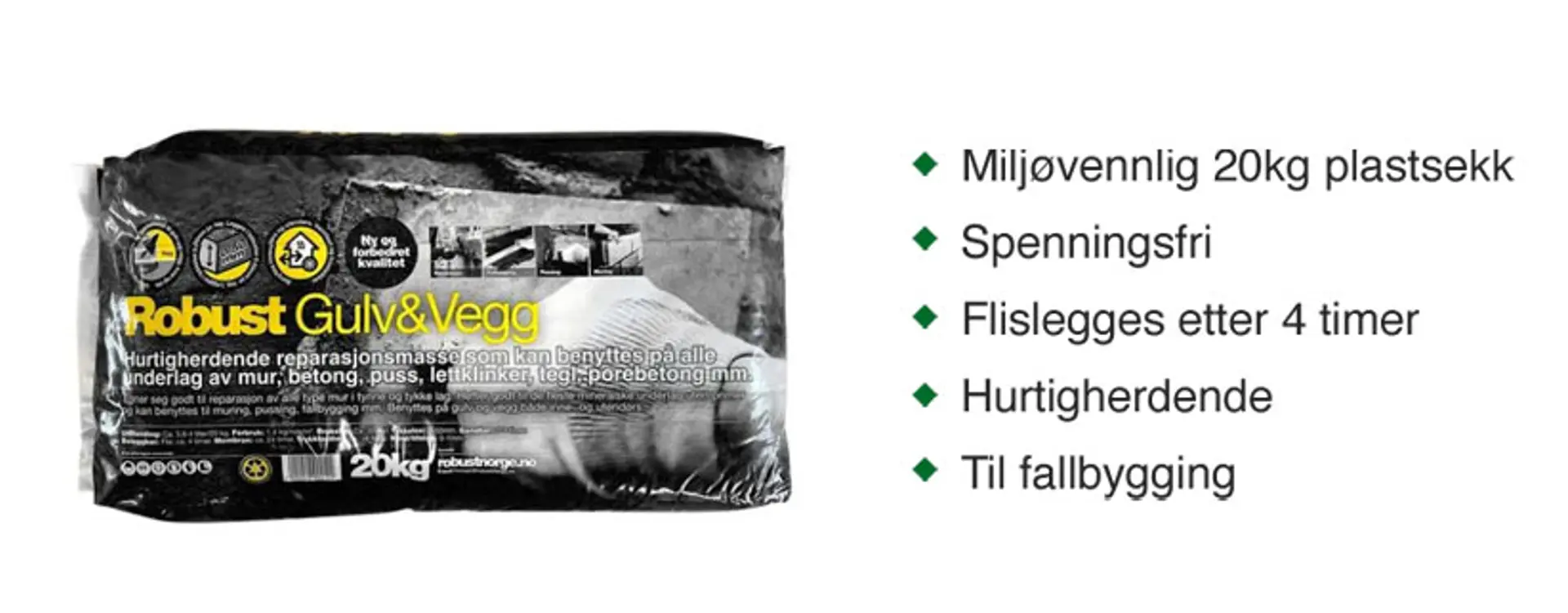 Robust Gulv&Vegg er et fleksibelt reparasjonsprodukt som kan brukes både innendørs og utendørs. Det egner seg til å reparere alt fra små sprekker til større skader, og kan brukes på de fleste mineralske underlag som mur, puss, tegl og betong. Produktet er en hurtigherdende, finkornet sparkelmasse som hefter godt og har lavere forbruk enn mange andre alternativer.