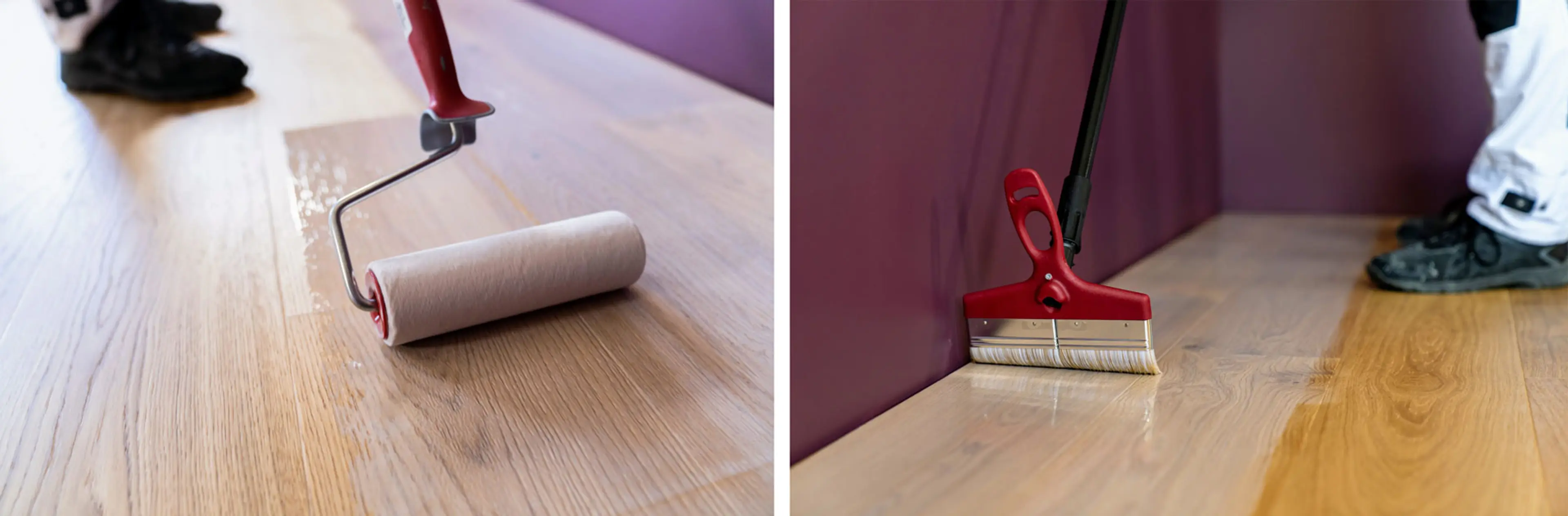 Etter at den fargede gulvlakken er påført, bruker du en gulvlakkpensel på forlengerskaftet for å etterstryke. Dra penselen i én retning, og tørk av overflødig lakk jevnlig.