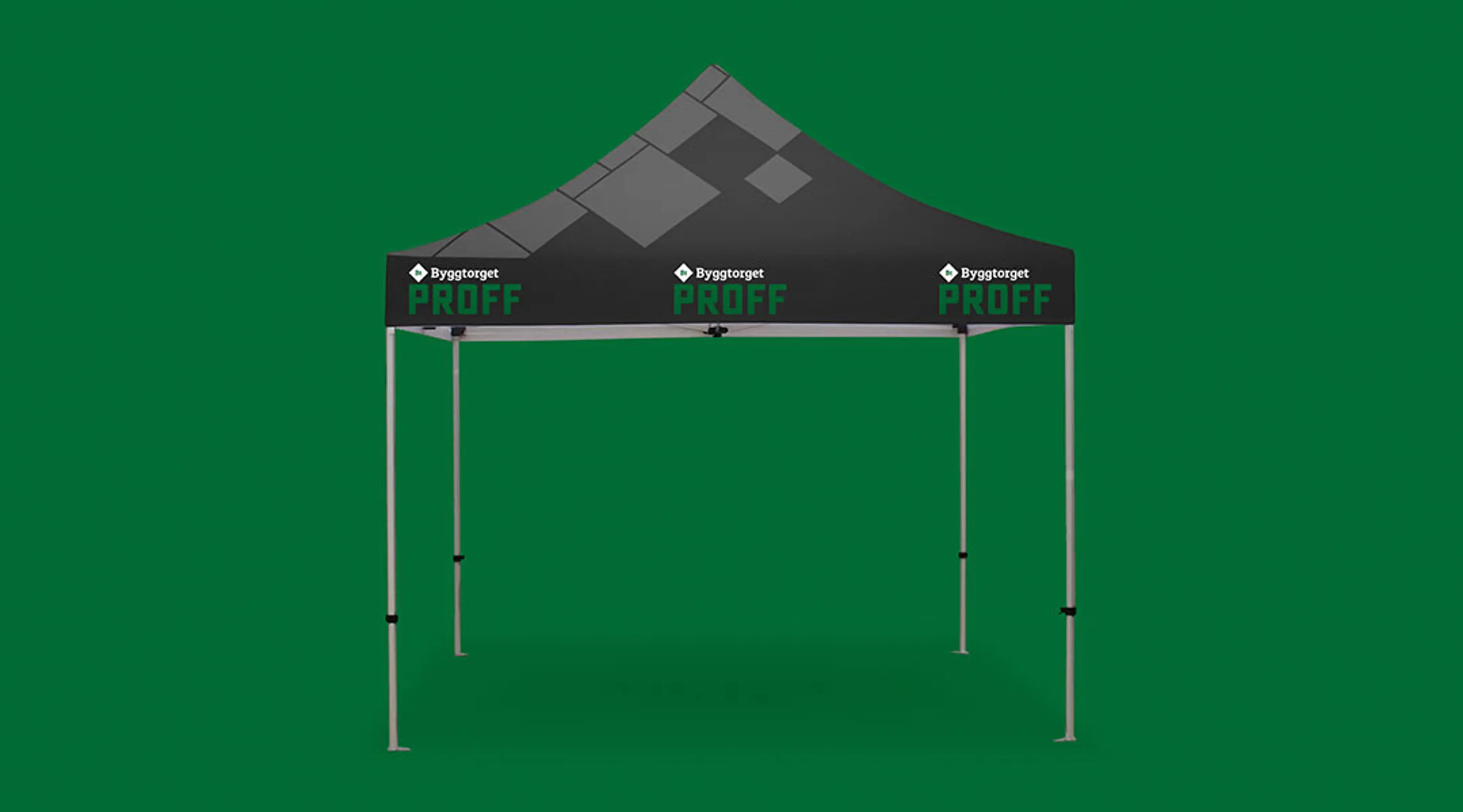 Velg blant størrelsene 3x3, 3x6 og 4x8 meter. Teltene leveres med tak som har Byggtorget-logo, hvor vegger med vindu, dør eller tette vegger med borrelås kan bestilles etter behov.